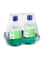 Wall mountable double eyewash stand, complete with 2 x 500ML eyewash bottle, with clear clip tight cover
