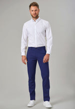 Slim fit, flat front, side pockets, twin hip jett pockets with button, telephone pocket, stretch waistband