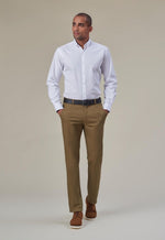 Slim fit, flat front, side pockets, twin hip jett pockets with button, telephone pocket, stretch waistband